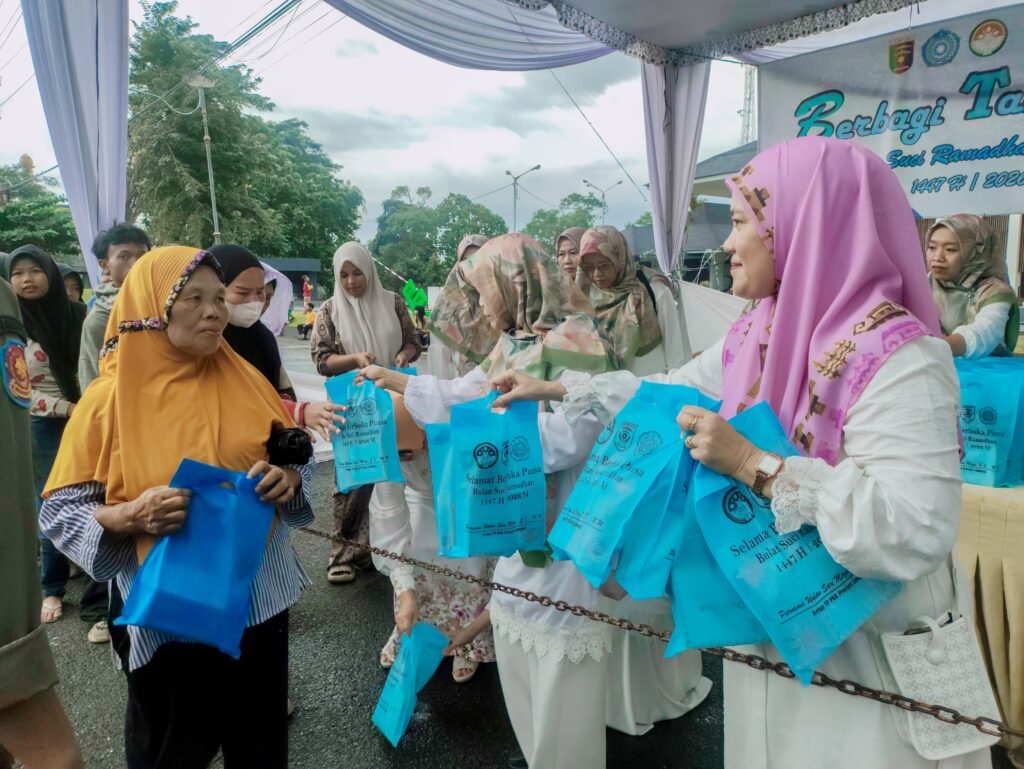 Bandar Lampung – Tim Penggerak Pemberdayaan dan Kesejahteraan Keluarga (TP. PKK) Provinsi Lampung, Dharma Wanita Persatuan Provinsi Lampung bersama Biro Hukum, Dinas Ketahan Pangan, Tanaman Pangan dan Holtikultura Provinsi Lampung dan Dinas Pariwisata Provinsi Lampung melaksanakan kegiatan berbagi takjil kepada masyarakat di halaman Mahan Agung, Sabtu (28/2/2026).