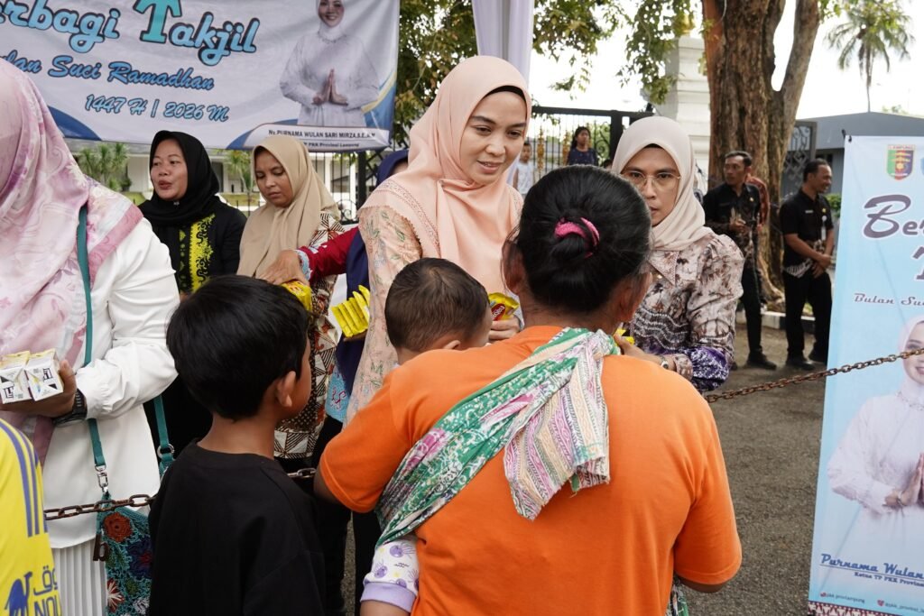Bandar Lampung — Memasuki hari ke-4 pelaksanaan kegiatan berbagi takjil, Tim Penggerak PKK Provinsi Lampung bersama Dharma Wanita Persatuan (DWP) Provinsi Lampung kembali membagikan paket berbuka puasa kepada masyarakat di depan Mahan Agung, Jumat (27/02/2026).