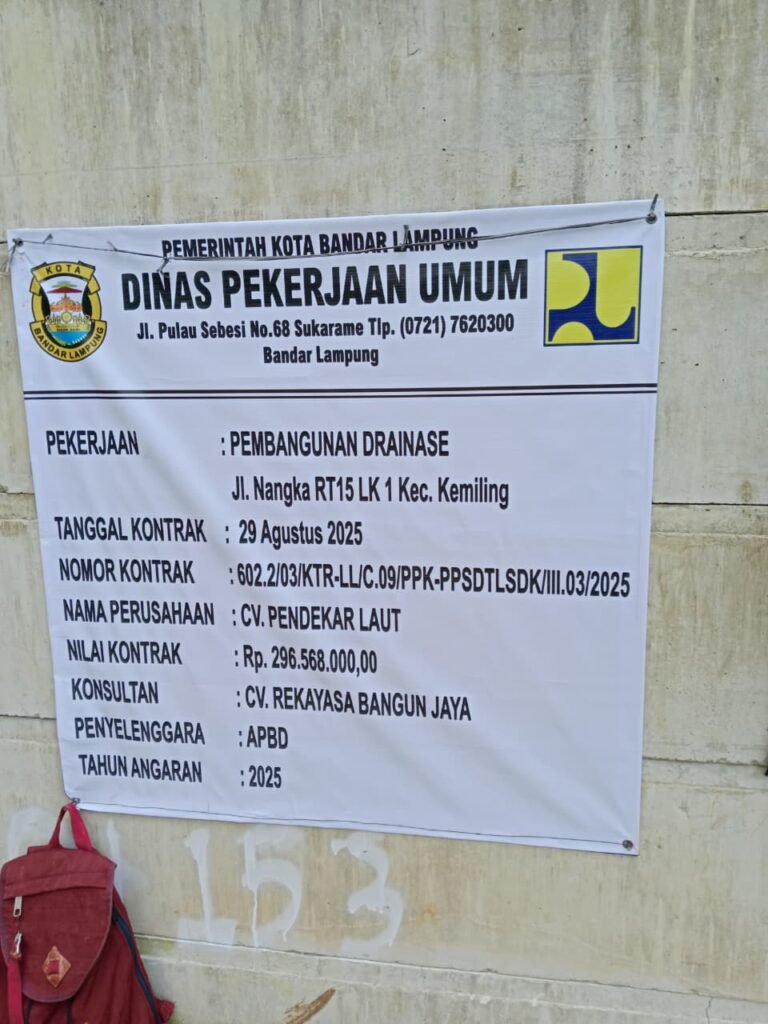 Bandar Lampung – Pekerjaan proyek drainase senilai Rp296.568.000 di Kelurahan Kemiling Permai, Kecamatan Kemiling, Kota Bandar Lampung, menuai sorotan warga. Proyek yang seharusnya menjadi solusi mengatasi genangan air ini justru dinilai dikerjakan asal jadi dan minim pengawasan