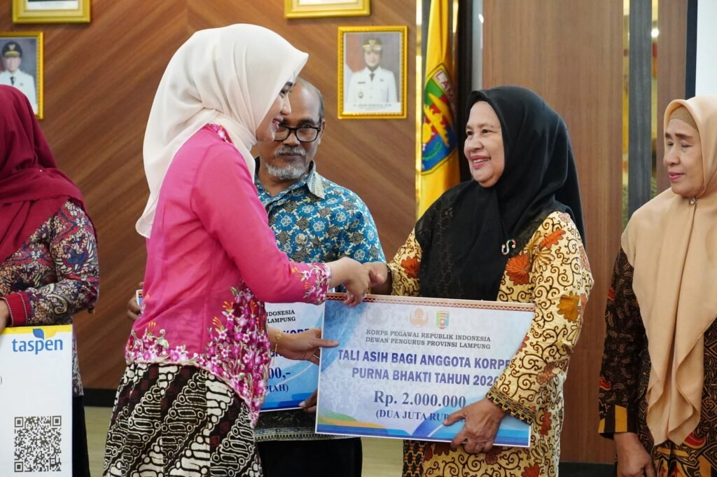 Ia menjelaskan, setiap PNS yang memasuki purna bakti menerima tali asih sebesar Rp2.000.000 dan plakat penghargaan dari Korpri Provinsi Lampung. Selain itu, diberikan santunan kepada ahli waris anggota Korpri yang meninggal dunia.