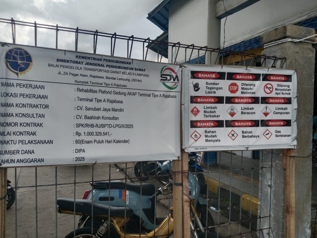 Pemandangan itu menjadi pintu masuk untuk menelusuri proyek Rehabilitasi Plafon Gedung AKAP Terminal Tipe A Rajabasa, proyek senilai Rp1.000.329.541 yang dibiayai DIPA Tahun Anggaran 2025 dan berada di bawah Kementerian Perhubungan RI, Direktorat Jenderal Perhubungan Darat, melalui Balai Pengelola Transportasi Darat (BPTD) Kelas II Lampung.