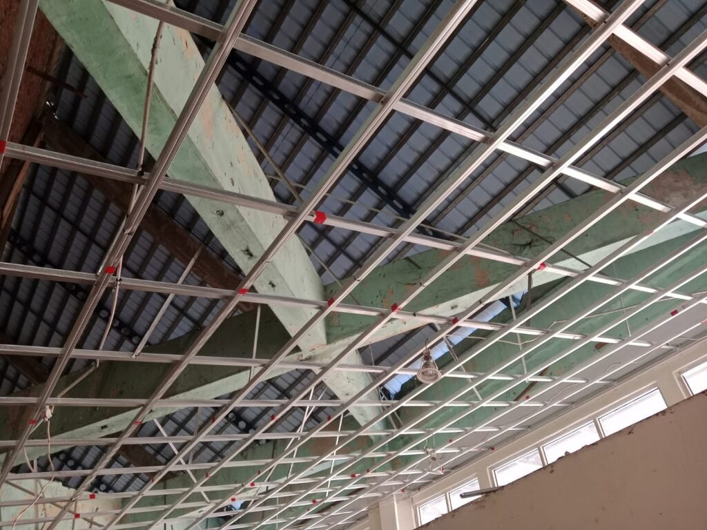 Selain kebocoran, awak media juga menemukan indikasi penggunaan material yang dipertanyakan. Rangka baja ringan yang terpasang tampak tidak seragam dan diduga bukan material baru. Kondisi tersebut menimbulkan pertanyaan mengenai kesesuaian pekerjaan dengan spesifikasi kontrak.